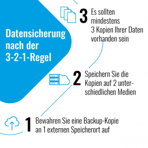 Im Idealfall orientiert man sich bei der Datensicherung an der sogenannten 3-2-1-Regel, die vom US-amerikanischen Fotografen Peter Krough geprägt wurde. Sein Gedankengang gegen Datenverlust: Man sollte stets drei Kopien seiner Daten vorliegen haben, nämlich die täglich genutzten Daten sowie zwei Backups. Diese beiden Backups sollten zudem auf zwei verschiedenen Speichertechnologien mit unterschiedlichen Sicherheitsmerkmalen abgespeichert werden, um das Risiko eines zeitgleichen Ausfalls zu minimieren. Im letzten Schritt sollte ein Backup außer Haus gelagert werden. Sollte z.B. das Bürogebäude Schaden erlangen, könnte man immer noch auf dieses Backup zurückgreifen. Ergo: drei Kopien, zwei Speichertechnologien, ein externer Ablageort.