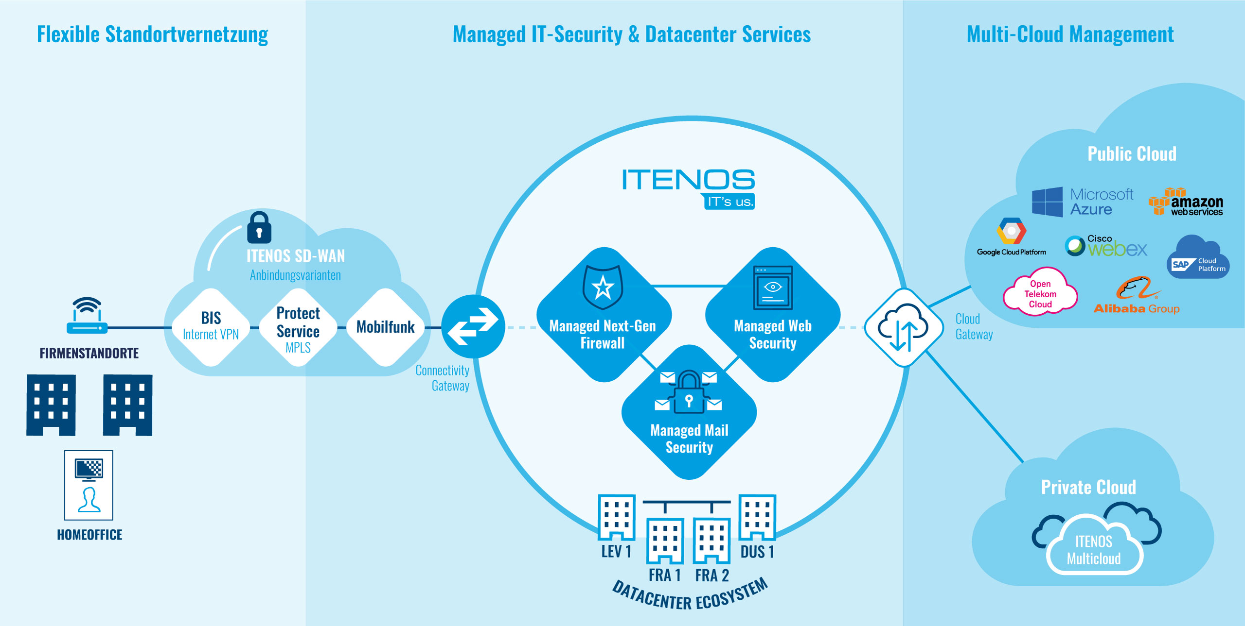 ITENOS setzt genau hier an: Mit modular aufgebauten ICT-Lösungen, die sich zu einem individuellen Gesamtpaket kombinieren lassen, bieten wir die besten Services kundenindividuell und herstellerneutral aus einer Hand: Von der Vernetzung von Firmenstandorten, Filialen und Heimarbeitsplätzen durch ITENOS SD-WAN über das Cloud Gateway, unsere Cloud Services Managed Private & Public Cloud , die IT-Security Lösungen Managed Next-Gen Firewall, Managed Web Security und Managed Mail Security sowie einen soliden IT-Backbone aus sieben zertifizierten deutschen Rechenzentren bis hin zur hochperformanten Anbindung an die ganz großen Cloud-Dienstleister.