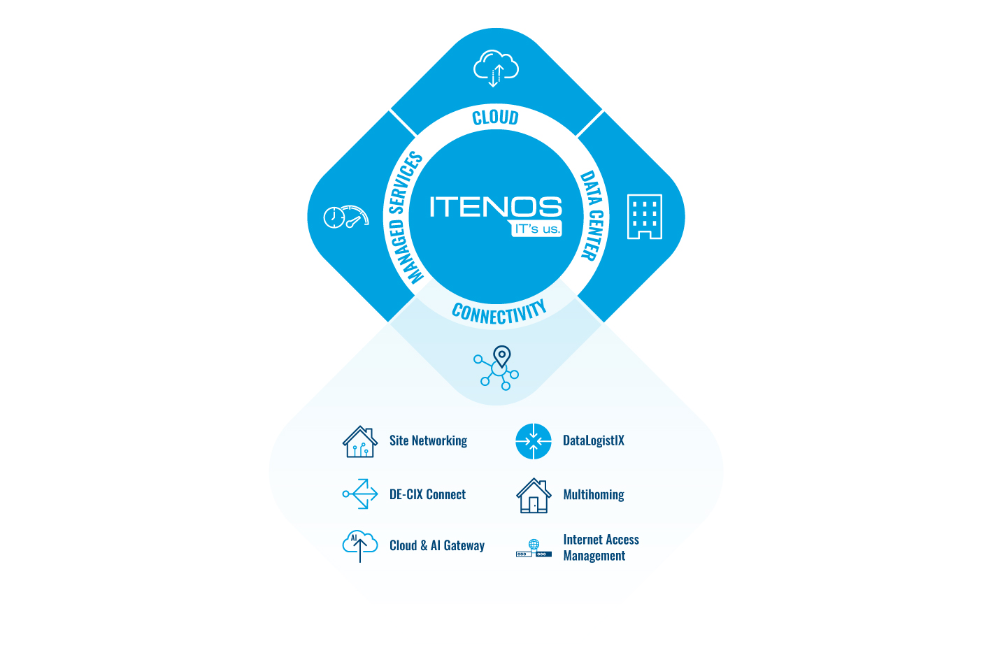 The DataLogistIX portfolio offers you a wealth of solutions via a single port. Save time and money with us and receive all connectivity services from a single source: Starting with optimal internet connection and fast data transfer via IP transit or internet nodes such as DE-CIX through to site networking with Ethernet or Metro Wave. Internet access by multi-homing and MPLS are also part of the package, as well as our Cloud & AI Gateway solution. With our comprehensive IP solutions, you are always well equipped.