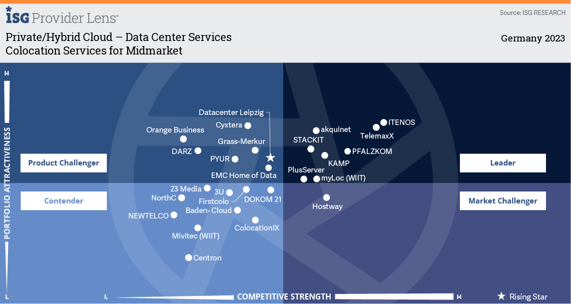 For the “Next-Gen Private/Hybrid Cloud – Data Center Services 2023” category of the Provider Lens™ award, ISG evaluated 20 colocation service providers for medium-sized business customers in the mid-market segment. As in previous years, ITENOS once again received the highest rating in the Leader quadrant from the research firm, confirming the outstanding quality of its services as a leading colocation provider.
